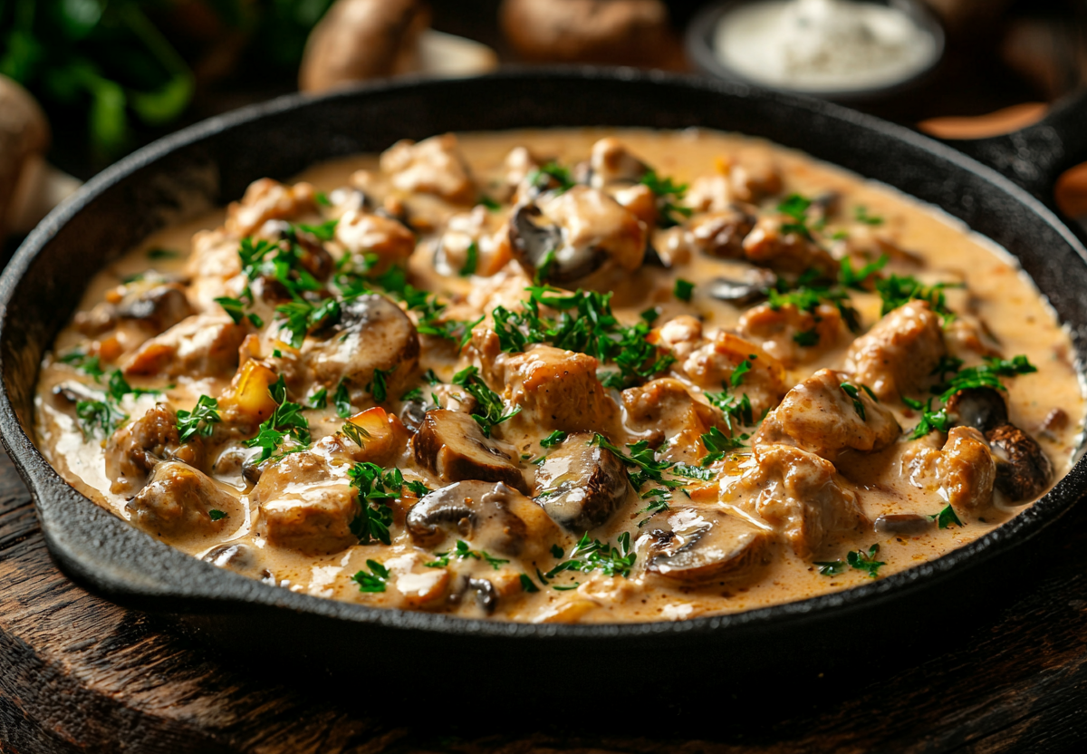 Мясо нарезаю небольшими кусочками поперек волокон. В хорошо разогретой чугунной сковороде обжариваю мясо до золотистой корочки — партиями, чтобы не тушилось. Перекладываю в отдельную посуду. В той же сковороде пассерую нарезанный полукольцами лук до прозрачности. Добавляю нарезанные пластинками грибы и обжариваю до румяности и выпаривания жидкости. Возвращаю мясо в сковороду к луку и грибам. Добавляю горчицу, сметану, соль и перец. Тщательно перемешиваю, чтобы все кусочки покрылись соусом. Накрываю крышкой и томлю на самом маленьком огне 25–30 минут, пока мясо не станет совершенно мягким. Если соус становится слишком густым, можно добавить пару ложек воды или бульона. Подаю скоблянку горячей, прямо в чугунной сковороде, посыпав свежей зеленью. Идеальный гарнир — рассыпчатая гречка или картофельное пюре.