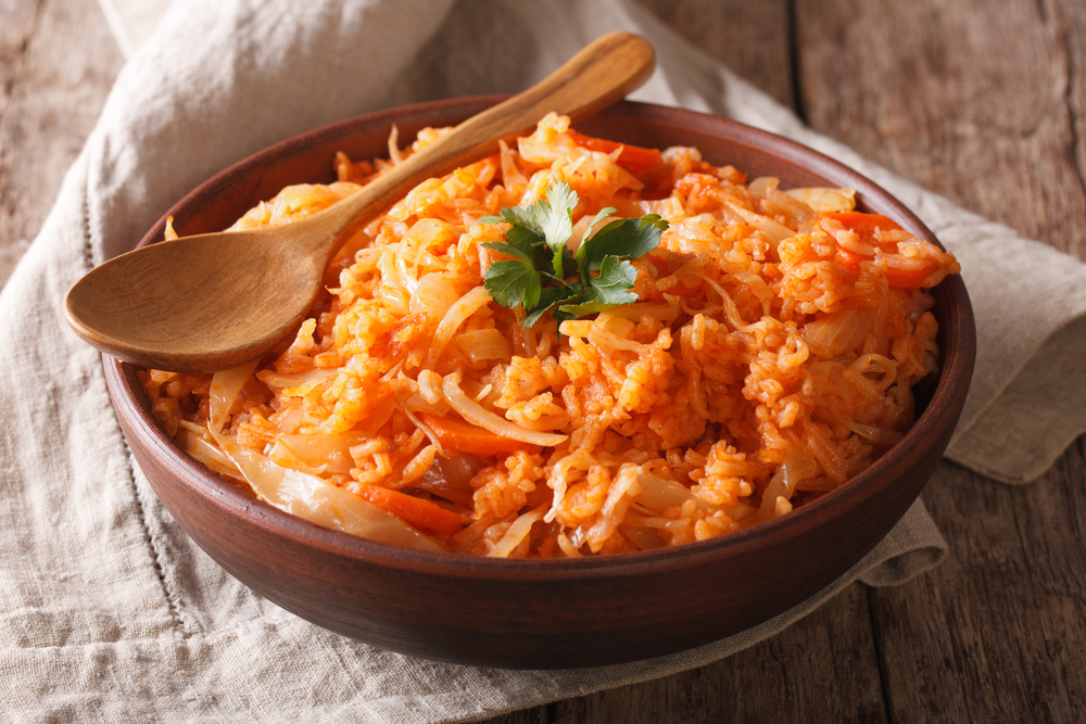 Рецепт: рис тщательно промойте до прозрачности и отварите до полуготовности в подсоленной воде. Лук нарежьте мелкими кубиками, морковь натрите на крупной терке, капусту тонко нашинкуйте. Обжарьте лук до прозрачности, добавьте морковь и жарьте еще 3–4 минуты. Затем добавьте капусту, перемешайте и тушите под крышкой 10–15 минут. В отдельной миске разведите томатную пасту в стакане теплой воды. Добавьте томатную заливку к капусте, посолите, поперчите, бросьте лавровый лист. Всыпьте полуготовый рис, влейте еще стакан воды, аккуратно перемешайте, накройте крышкой и тушите на медленном огне 15–20 минут до полной готовности риса и капусты. В конце добавьте мелко рубленную зелень.