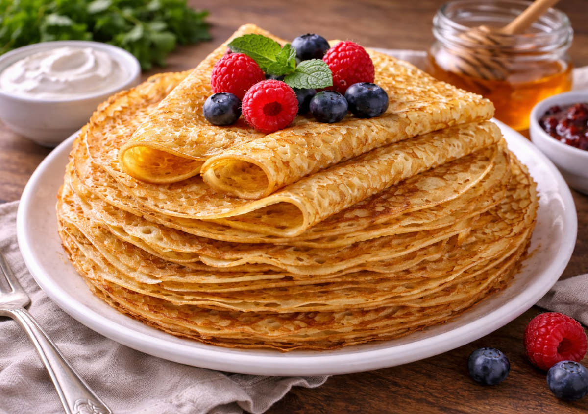 Эти блинчики — как из детства: тонкие, нежные, с кружевными краями и ароматом уюта. Стоит поставить сковороду на плиту, и дом сразу наполняется праздничным настроением. Они мягкие, не рвутся, отлично сворачиваются и подходят и к варенью, и к меду, и к сметане — проверенный вариант на каждый год.