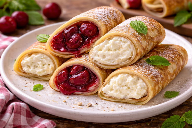Как готовить. Сначала готовят блинчики: яйца смешивают с кефиром, добавляют муку, разрыхлитель, соль, подсластитель и растительное масло, тесто хорошо перемешивают до однородности и выпекают тонкие блинчики на антипригарной сковороде с двух сторон. Для вишневой начинки ягоды с подсластителем уваривают около пяти минут, затем крахмал разводят в холодной воде и тонкой струйкой вводят в ягоды, постоянно помешивая, пока масса не станет густой и блестящей. Творожную начинку просто соединяют до кремовой текстуры, при желании оба вида творога можно заменить 200 г обычного брикетного. Сборка простая: в каждый блинчик заверните начинку — поровну вишневую и творожную.
