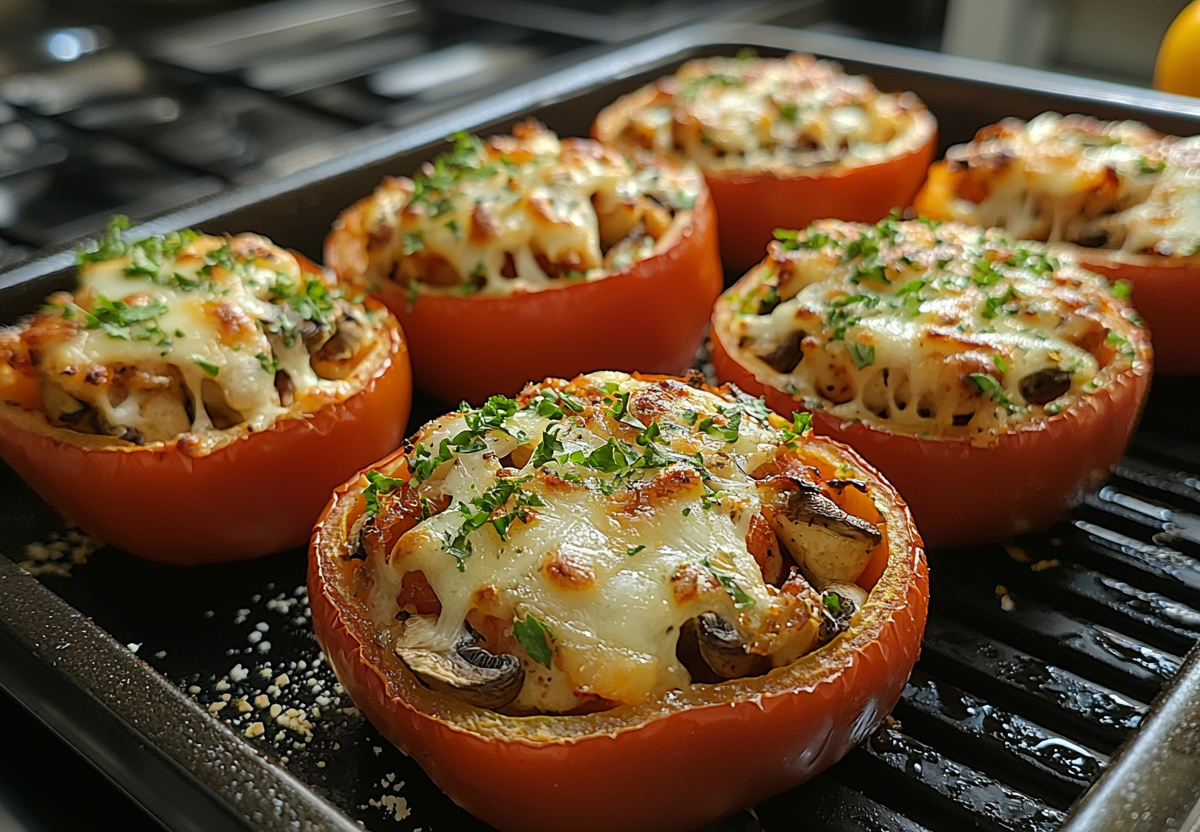 Болгарский перец разрезать пополам, удалить семена, не трогая плодоножку. Выложить половинки перцев на противень, наполнить начинкой из курицы, грибов и лука. Сверху каждую заготовку накрыть кружком помидора и дополнить тертым сыром, смешанным с майонезом.