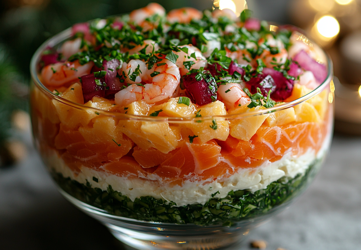 Слоеный микс с креветками и рыбой — готовим изысканную альтернативу селедке под шубой на Новый год