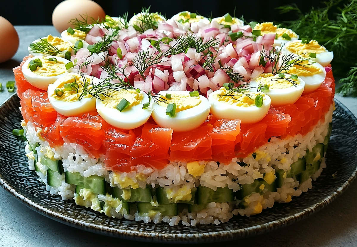2. Яйца натрите, смешайте с рубленым зелёным луком. Укладывайте слоями: 1) рис + заправка, 2) красная рыба, 3) укроп, 4) красный лук, 5) огурцы + заправка, 6) яичная смесь, 7) тёртая морковь + заправка. Уберите в холодильник на 2 часа. Подавайте с соевым соусом.