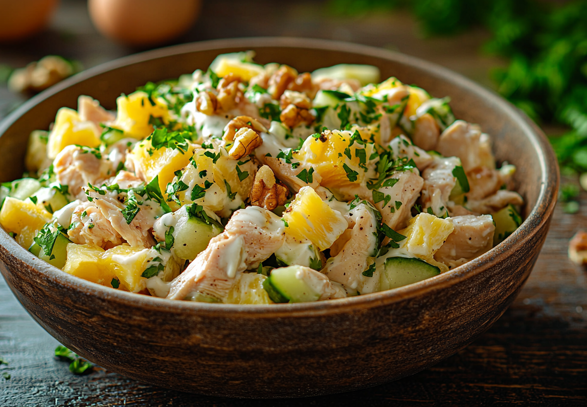 Слопали даже те, кто говорил «не сочетается»! Салат с сыром-косичкой, копченой курицей и ананасом! Этот салат — взрыв вкусов! Нежная копченая курица, пикантный колбасный сыр, сладкие ананасы и хрустящие орехи создают идеальную гармонию. Просто, сытно и невероятно вкусно — идеальный вариант для праздника или уютного ужина.