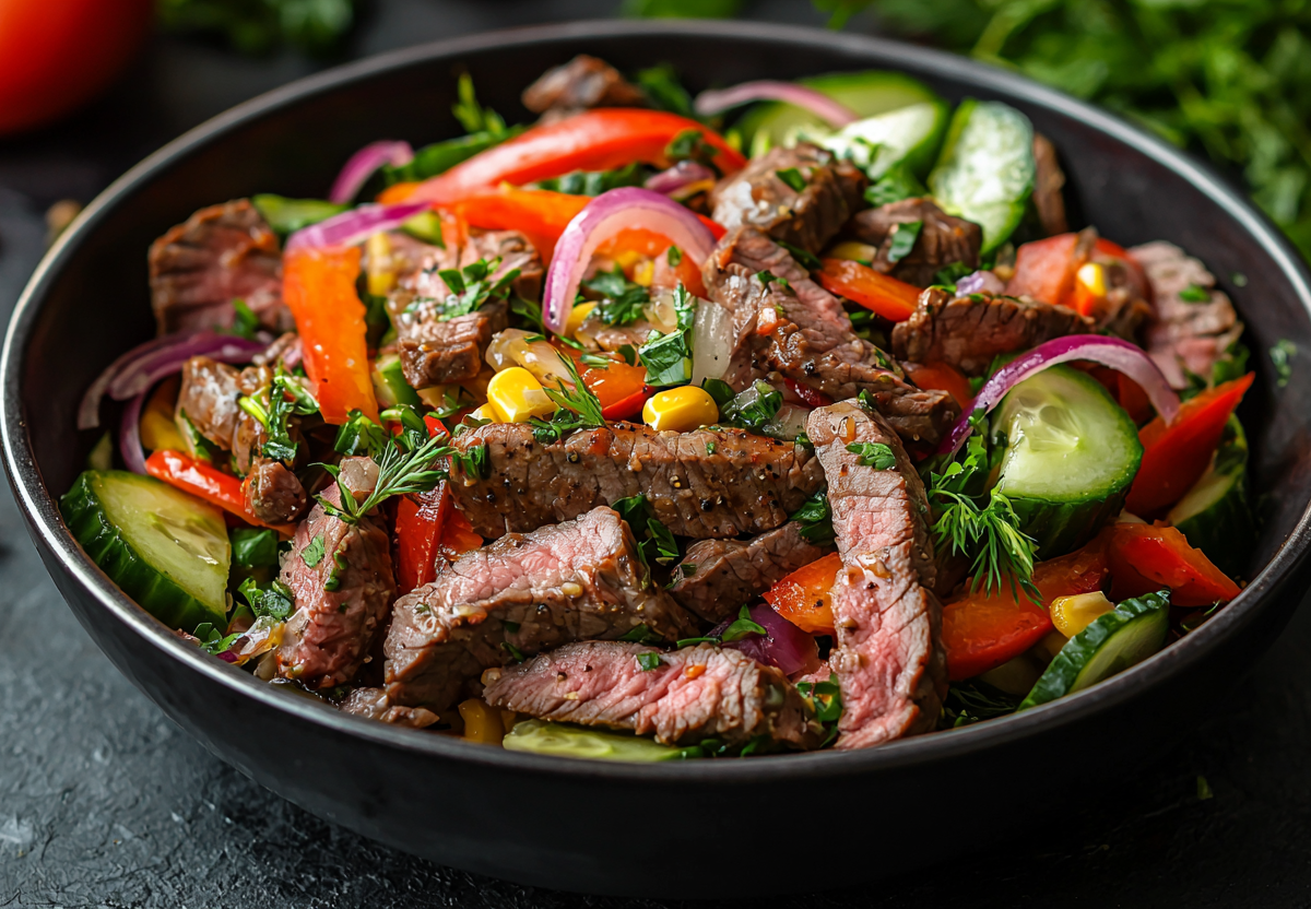 Салат «Объедение» — взрыв свежести и вкуса! Этот салат — идеальный баланс сытности и легкости! Нежная говядина, хрустящие овощи и пикантная заправка делают его настоящей звездой стола. Подойдет и для праздничного ужина, и для сытного обеда.