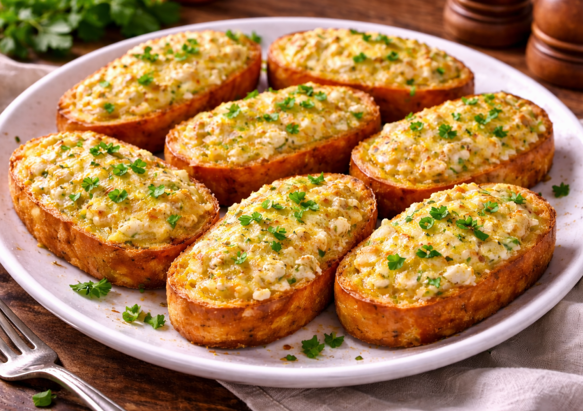 Приготовление: яйца взбейте с молоком, солью, перцем и травами. Ломтики хлеба обмакните в яичную смесь и выложите на противень с пергаментом. Творог смешайте с тертым сыром до однородности и распределите начинку поверх хлеба. Отправьте в разогретую до 180 °C духовку и запекайте 15–20 минут до золотистой корочки. Подавайте горячими — с ароматом сыра и хрустящей корочкой.