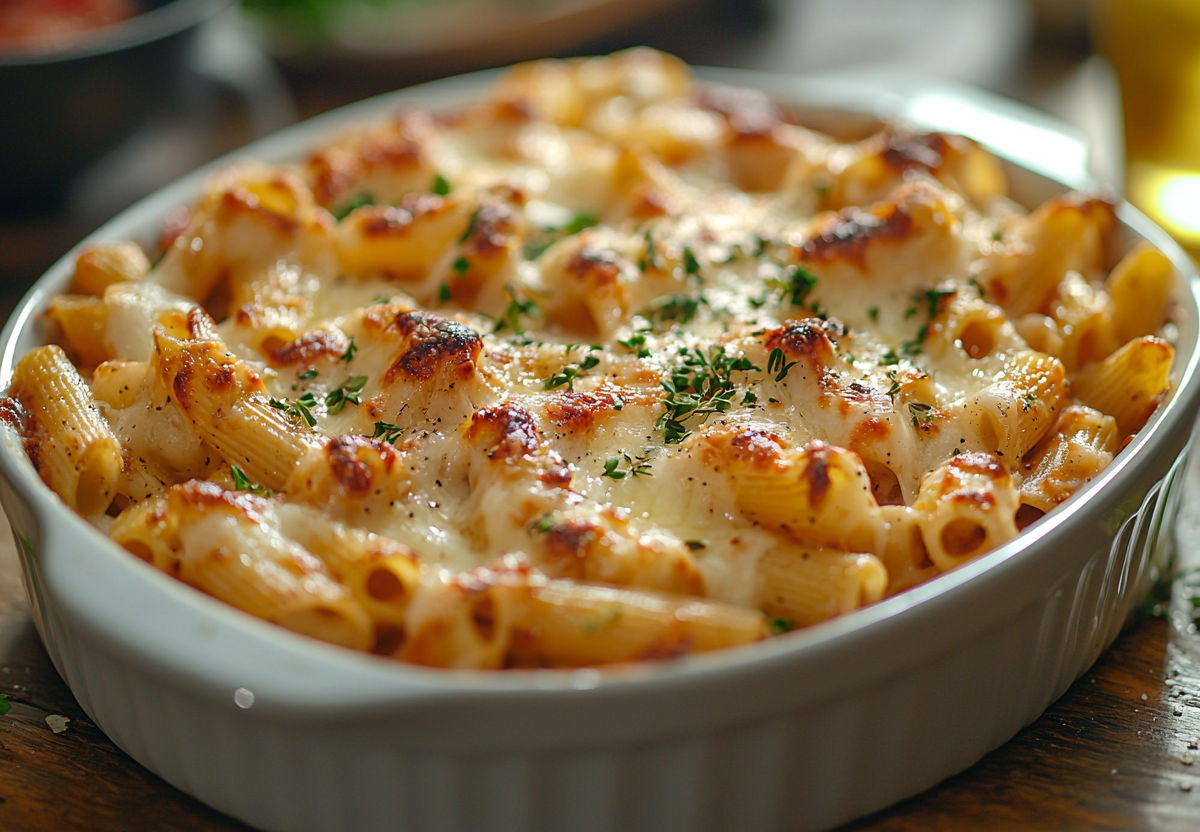 Вкус этого блюда — нежные макароны в сливочной сметанной пропитке с сочной курицей и аппетитной корочкой. Молоко и сметана идеально пропитывают пасту, делая ее мягкой, но сохраняя форму, а курица остается сочной благодаря запеканию в жидкости.