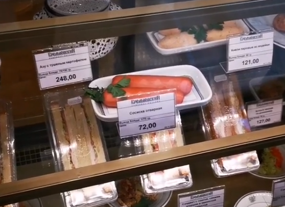 Например, пара сосисок стоит всего 72 рубля, свекольный салат — 61 рубль, брокколи можно купить за 105 рублей, а филе судака — за 410 рублей. Сэндвич с сёмгой и огурцом — 251 рубль, жареные баклажаны — 116 рублей, а салат оливье — 88 рублей.