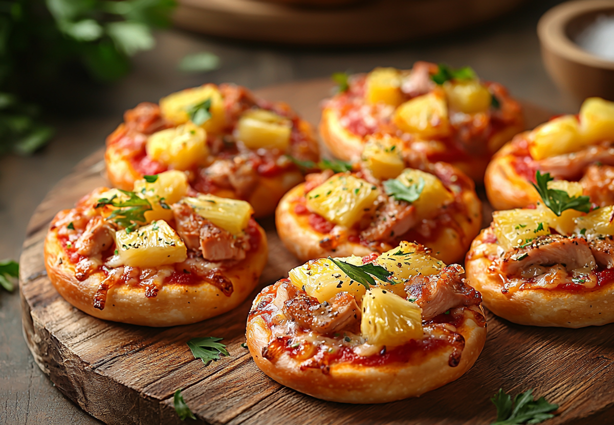 Готовим румяные мини-пиццы с курицей и ананасом! Эти мини-пиццы станут настоящим спасением, когда нужно быстро накормить гостей или устроить необычный ужин. Всего 15–20 минут — и перед вами ароматные кружочки с сочной курицей, сладковатыми ананасами и золотистой сырной корочкой.