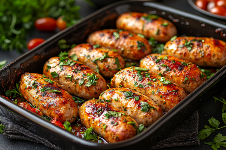 Рецепт: пропустите 500 г куриного филе через мясорубку, добавьте 1 тертую луковицу, 100 г натертого кабачка, 50 г тертой моркови, 1 яйцо, 2 ст. л. овсяных хлопьев, соль, перец, мяту и кориандр. Сформируйте колбаски и запекайте в духовке на пергаменте 25 минут при 200 °C или готовьте на антипригарной сковороде без масла.