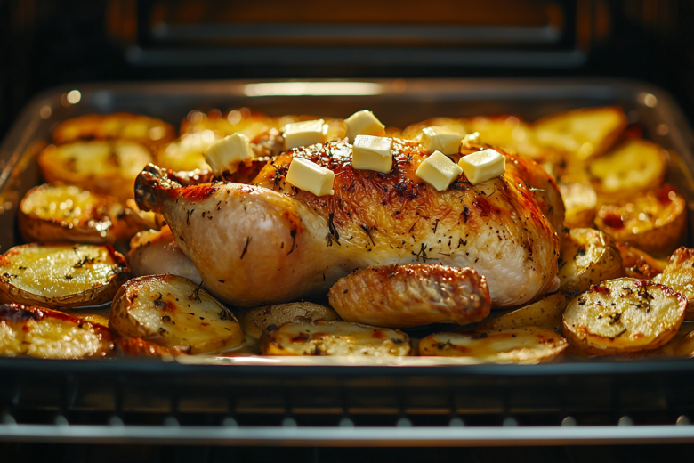Вам понадобится: целый цыпленок (1,3-1,5 кг), 1 кг картофеля, 100 г сливочного масла, 3-4 зубчика чеснока, 1 лимон, смесь сушеных трав, соль, черный перец, паприка, растительное масло. Картофель очистите, нарежьте крупными дольками, сбрызните растительным маслом, посыпьте солью, перцем, паприкой и выложите на противень, застеленный пергаментом. Цыпленка натрите внутри и снаружи смесью соли, перца, паприки, измельченного чеснока и сока половины лимона. Вторую половину лимона поместите внутрь тушки. Свяжите ножки. Теперь трюк для корочки: возьмите около 80 г холодного сливочного масла, нарежьте его на небольшие кубики. Возьмите 6-8 зубочисток и на каждую насадите по кусочку масла. Аккуратно воткните эти зубочистки с маслом в кожу птицы, равномерно распределив по всей поверхности грудки и ножек. Выложите цыпленка грудкой вверх прямо на картофель. Запекайте в разогретой до 180-200°C духовке 1 час 30 минут.