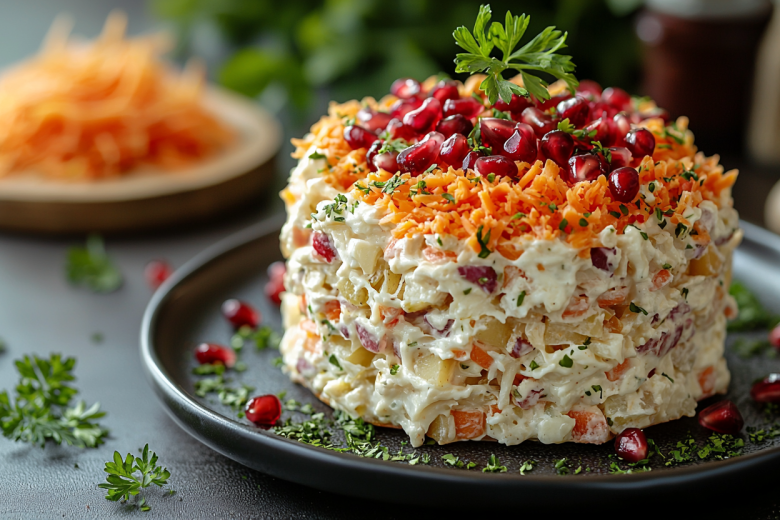Беру копченую курицу, картофель и гранат — и собираю салат «Красная шапочка», который внешне напоминает знаменитый «Гранатовый браслет», но готовится проще и получается в миллион раз вкуснее. Это гениально простое и невероятно сочное блюдо, идеальное для праздничного стола или уютного ужина. Его необычность в том, что слои из копченого мяса, орехов, яиц, моркови и сыра пропитываются майонезом, а гранатовые зерна сверху делают салат нарядным и аппетитным. Получается обалденная вкуснятина: нежный картофель, ароматная копченая курочка, хрустящие орешки и сочные гранатовые зерна создают идеальный баланс вкусов. Готовится быстро, а выглядит так, будто вы провели на кухне полдня.