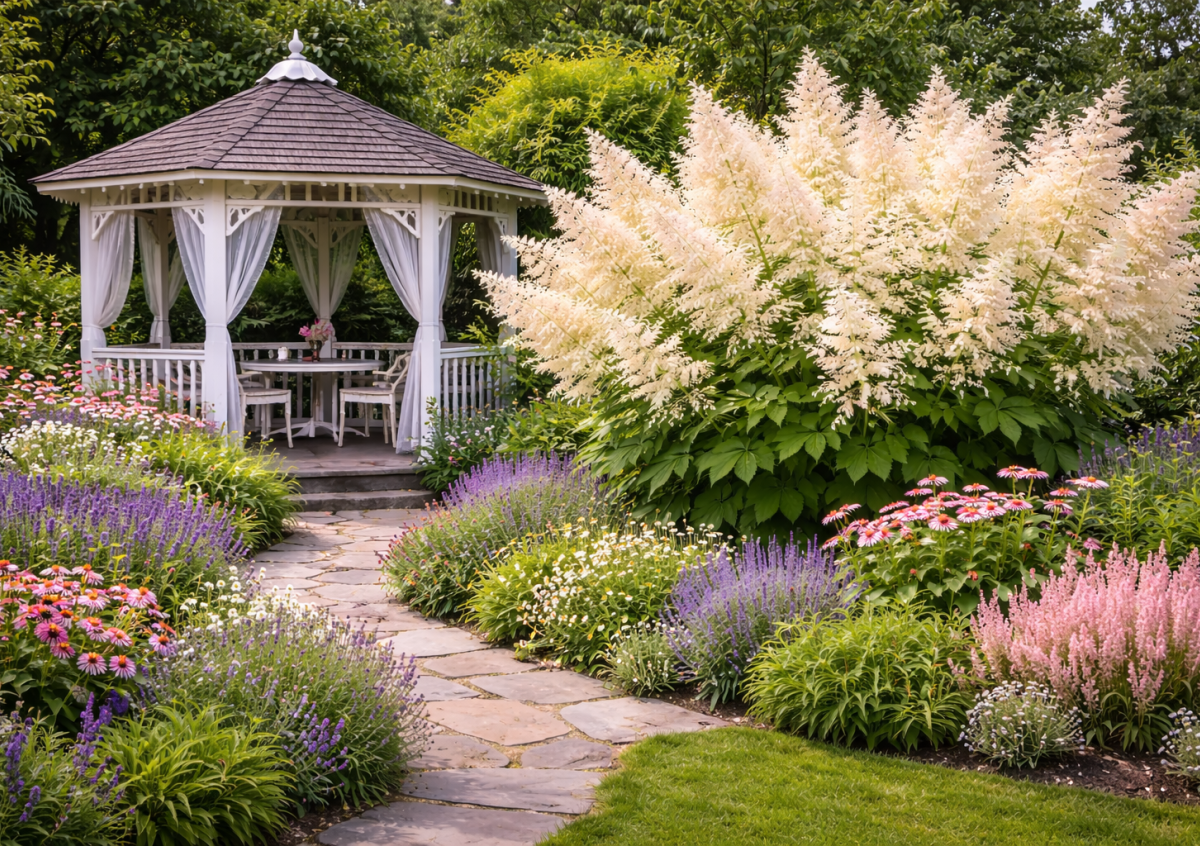 Главное достоинство волжанки — теневыносливость. Она отлично растет в полутени и даже в глубокой тени, где большинство культур чувствуют себя плохо. В июне — июле растение зацветает крупными кремово-белыми метелками с легким медовым ароматом, привлекая пчел и полезных насекомых.