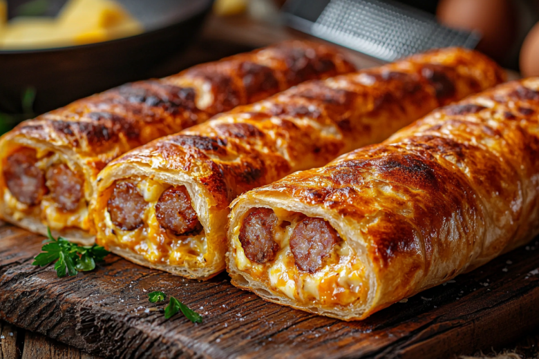 Возьмите два листа армянского лаваша и нарежьте их полосками по длине сосисок. Для начинки подойдет твердый или плавленый сыр — натрите 180 г на крупной терке. Три яйца взбейте в миске с щепоткой соли, паприкой и сушеными травами. На край полоски лаваша положите немного сыра, сверху — сосиску или охотничью колбаску, затем плотно заверните. Чтобы край не разворачивался, смажьте его яичной смесью.