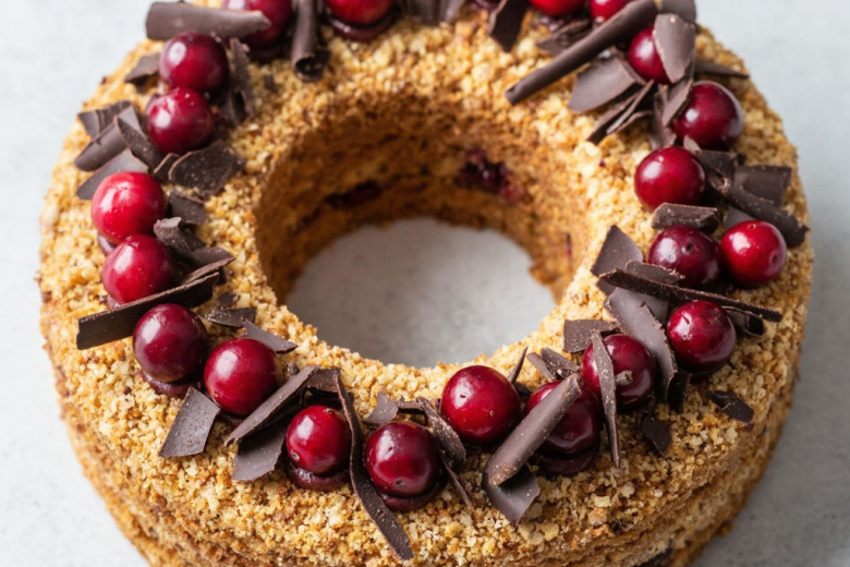 Создаем праздничное настроение: бисквитный торт «Рождественский венок» с клюквой и бельгийским шоколадом