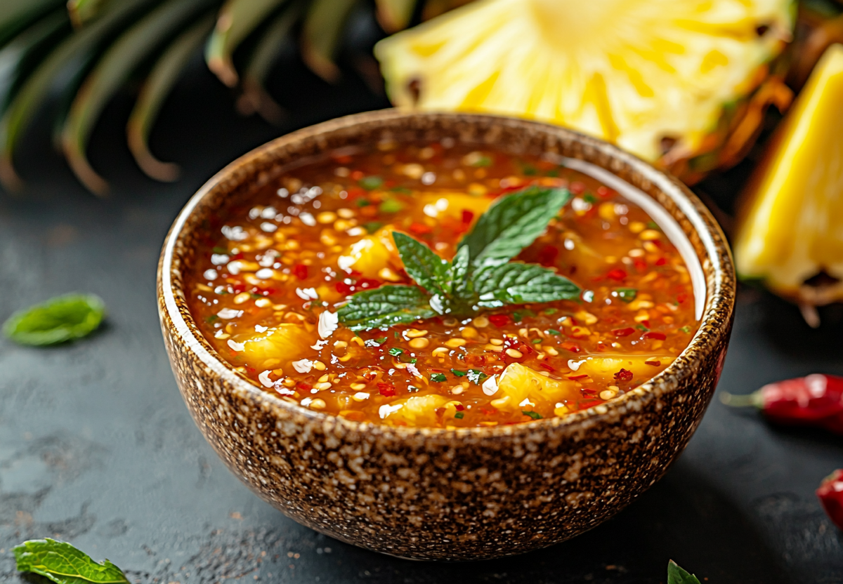 Начинаю с подготовки перца: разрезаю чили вдоль, удаляю семена и перегородки (это снизит остроту), затем мелко нарезаю. Ананас нарезаю кубиками и измельчаю в блендере до состояния однородного пюре. Если хочется более нежной текстуры, можно протереть пюре через сито. В ананасовую основу добавляю нарезанный чили, вливаю оливковое масло, рисовый уксус и сладкий соус чили. Тщательно взбиваю венчиком или в блендере на низкой скорости до полной однородности. В конце добавляю паприку — она придает соусу красивый золотистый оттенок и легкий дымный аромат. Пробую и при необходимости регулирую остроту — можно добавить еще чили или, наоборот, разбавить соус небольшим количеством ананасового сока. Готовый соус переливаю в стеклянную банку и храню в холодильнике до 5 дней. Идеально подходит к курице гриль, свиным ребрышкам, креветкам или тофу.