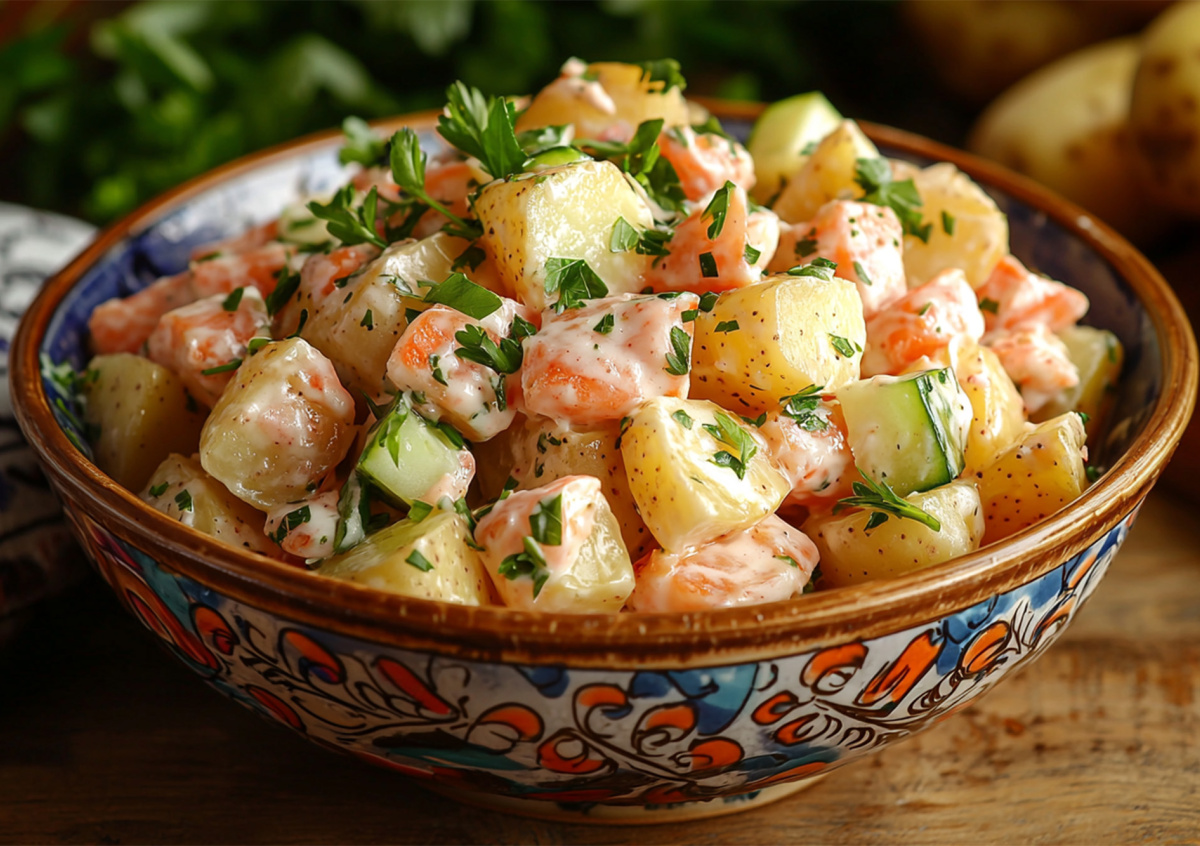 - Картофель отварить в мундире (можно использовать вчерашний). Огурец и лук нарезать тонкими полукольцами. Рыбу размять вилкой.