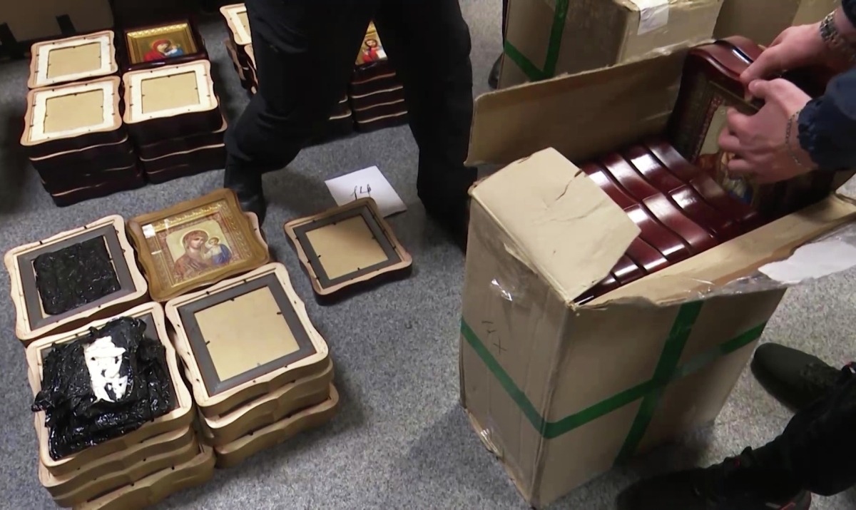 Федеральная служба безопасности 2 апреля обнародовала кадры досмотра и изъятия икон с Украины, с которыми контрабандным путем пытались доставить в Россию взрывчатку. Из груза извлекли 27 самодельных взрывных устройств, 70 кг пластичного взрывчатого вещества повышенной мощности, 91 электродетонатор и части выстрела к РПГ-7. Взрывчатка была прикреплена к раме на обратной стороне икон.