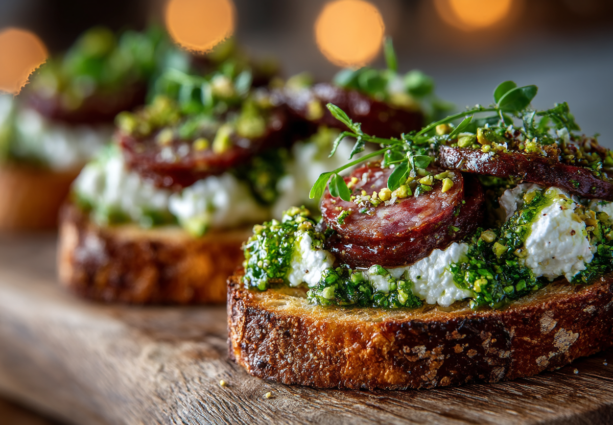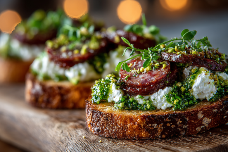 Хлеб чиабатта или багет — 4–6 ломтиков, колбаса вареная (докторская) — 150–200 г, сыр страчателла — 125–150 г, фисташки очищенные — 50 г + для подачи, базилик свежий — 15–20 г, сыр пармезан — 20 г, чеснок — 1 зубчик, масло оливковое — 60–80 мл, соль, перец черный молотый — по вкусу.