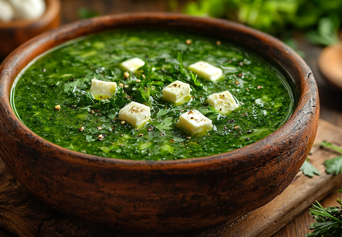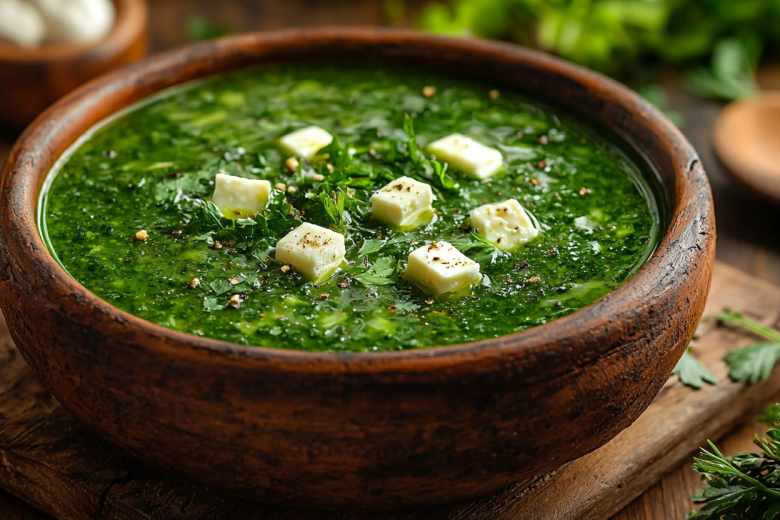 Для супа мне понадобится: большое количество зелени (пучок кинзы, петрушки, укропа, зеленый лук), сыр сулугуни (150–200 г), яйца (2–3 шт.), чеснок (2–3 зубчика), соль, перец, немного винного уксуса (по желанию), кипяток (около 1,5 л).