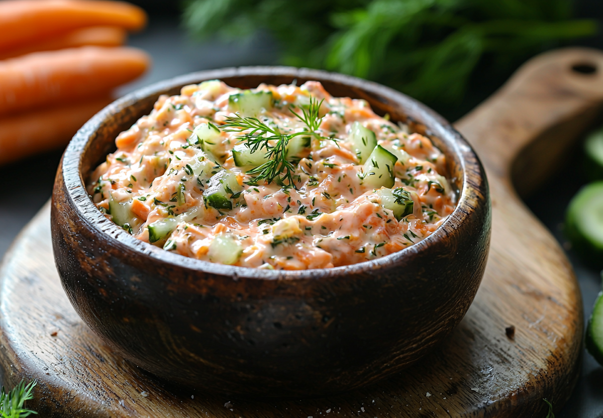 Чеснок натрите на мелкой терке и добавьте к моркови с огурцами. Следом отправьте майонез и все тщательно перемешайте.
