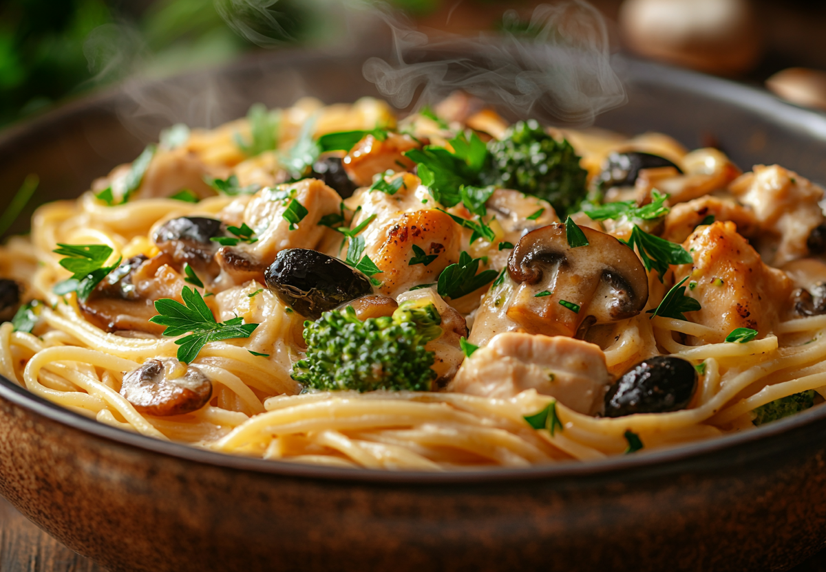 Суперские макароны с курицей, шампиньонами и оливками! Быстрый рецепт на ужин, который покорит даже самых привередливых. Ужин, который легко приготовить дома. Нежное куриное бедро, ароматные грибы, свежая брокколи и сливочный соус создают гармоничное сочетание вкусов. Это отличный вариант для буднего дня или особого ужина.
