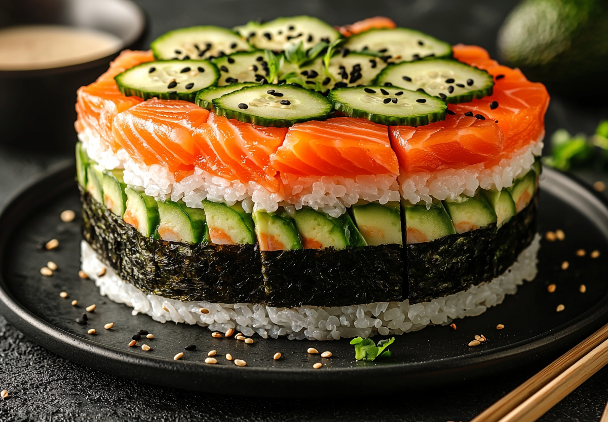 Суши-торт без выпечки — праздничное блюдо без лишних хлопот! Этот эффектный торт сочетает все любимые вкусы японской кухни в оригинальной подаче. Нежные слои риса, свежего авокадо и слабосоленой форели создают идеальную гармонию, а приготовление занимает минимум времени!