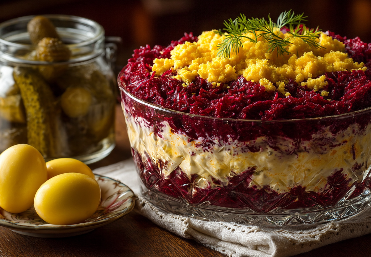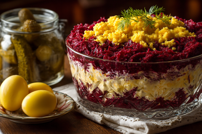 Сладковатая вареная свекла, пикантные маринованные огурцы и ароматный чеснок в сметанной заправке создают идеальную гармонию вкусов. А желтковая «шапка» сверху придает салату царский вид.