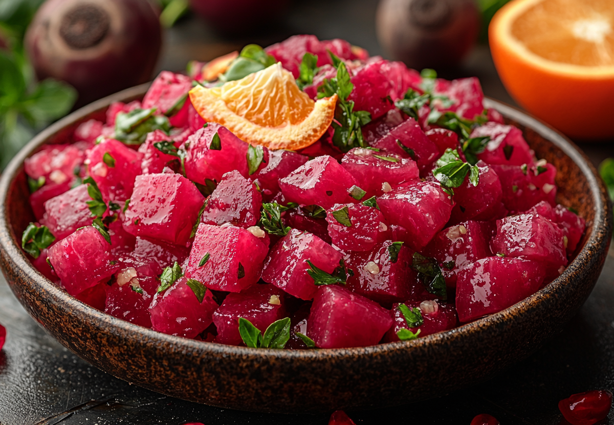 Одно из таких ярких и необычных блюд — свекольный салат с апельсином и козьим сыром. Это идеальное сочетание сладости, цитрусовой свежести и нежности сыра, которое превратит обычное блюдо в гастрономическое открытие.