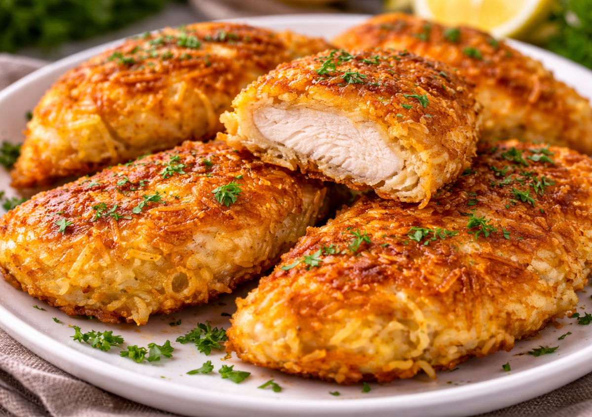 Если обычные куриные отбивные уже надоели, попробуйте этот вариант. Секрет шницелей — в густой картофельной смеси, которая образует вокруг мяса румяную, хрустящую корочку. Снаружи получается золотистая шубка, а внутри — сочная курица.