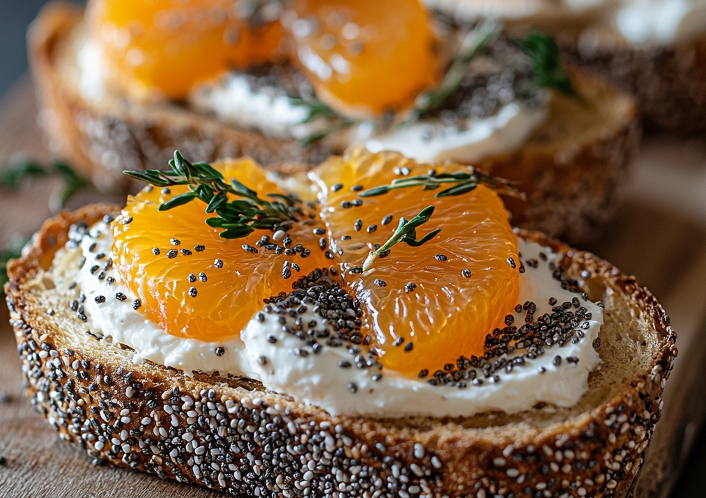 - Готовую брускетту посыпаем семенами чиа. Если есть желание, можно добавить немного зелени.