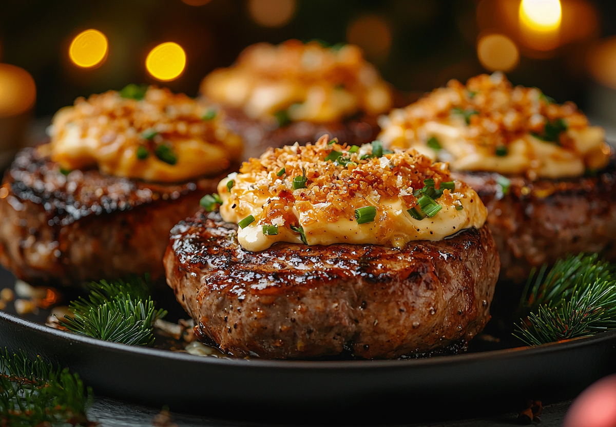 Вам понадобится: 4 свиных стейка (толщиной 2 см), 300 г шампиньонов, 1 луковица, 150 г твердого сыра, 50 г мякиша белого хлеба или панировочных сухарей, 2 ст. л. сметаны или майонеза, растительное масло, соль, перец, специи для мяса. Стейки отбейте, посолите, поперчите, обжарьте на раскаленной сковороде по 2 минуты с каждой стороны до корочки. Переложите в форму для запекания. В той же сковороде обжарьте мелко нарезанные лук и грибы до готовности и испарения жидкости, посолите. На каждый стейк выложите горкой грибную начинку. Смешайте тертый сыр, хлебную крошку (благодаря ей корочка будет хрустящей) и сметану. Равномерно распределите эту смесь поверх грибов, формируя «шапочку». Запекайте в разогретой до 180 °C духовке 15–20 минут, пока сыр не расплавится и не образует золотистую хрустящую корочку.