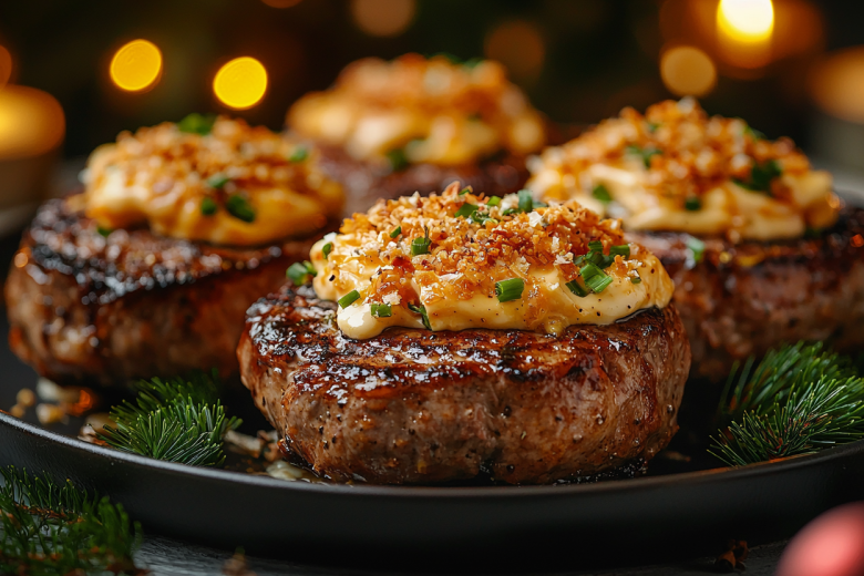 Вам понадобится: 4 свиных стейка (толщиной 2 см), 300 г шампиньонов, 1 луковица, 150 г твердого сыра, 50 г мякиша белого хлеба или панировочных сухарей, 2 ст. л. сметаны или майонеза, растительное масло, соль, перец, специи для мяса. Стейки отбейте, посолите, поперчите, обжарьте на раскаленной сковороде по 2 минуты с каждой стороны до корочки. Переложите в форму для запекания. В той же сковороде обжарьте мелко нарезанные лук и грибы до готовности и испарения жидкости, посолите. На каждый стейк выложите горкой грибную начинку. Смешайте тертый сыр, хлебную крошку (благодаря ей корочка будет хрустящей) и сметану. Равномерно распределите эту смесь поверх грибов, формируя «шапочку». Запекайте в разогретой до 180°C духовке 15-20 минут, пока сыр не расплавится и не образует золотистую хрустящую корочку.
