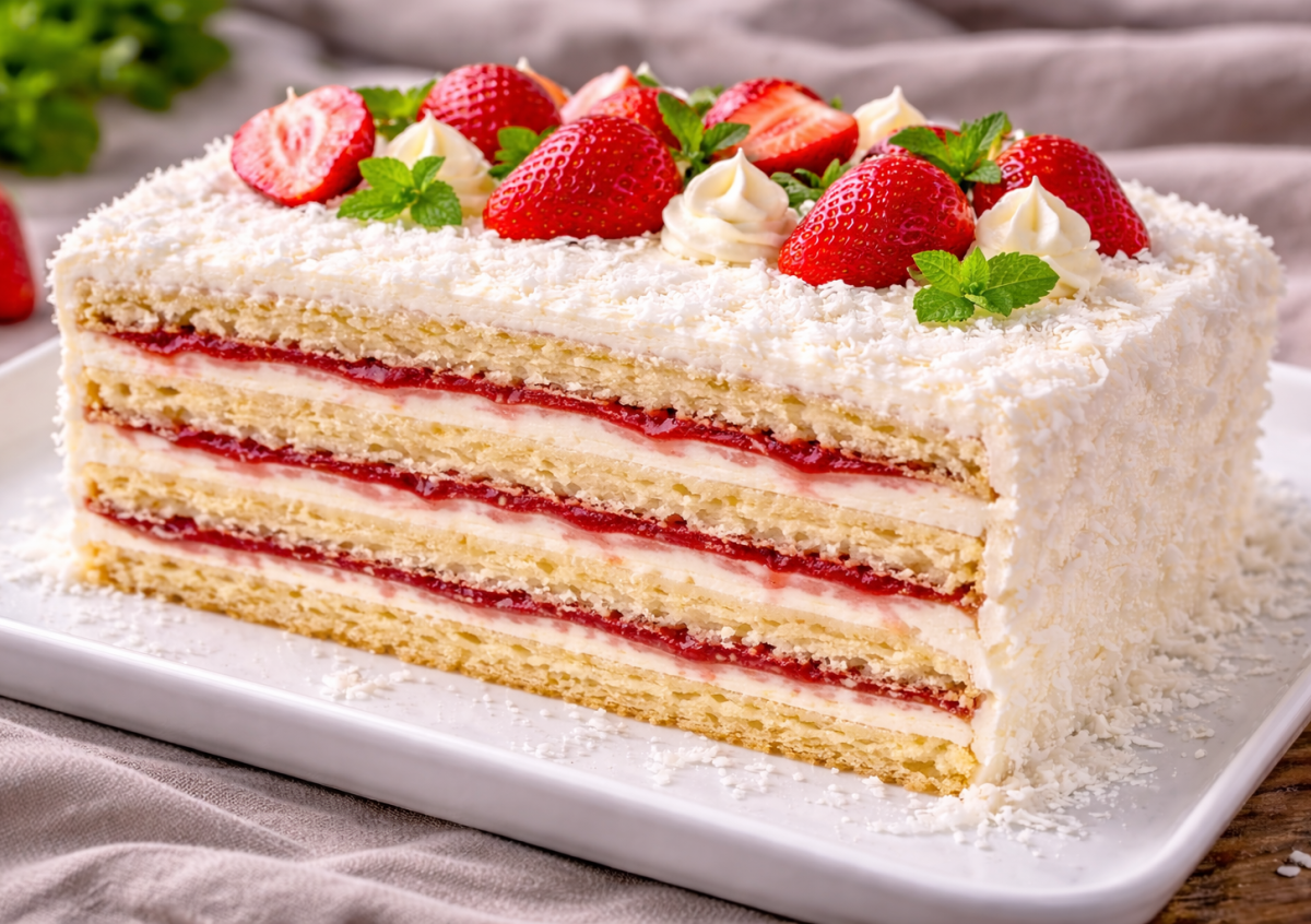 Ингредиенты. Коржи: яйца — 4 шт., соль — щепотка, сгущенное молоко — 300 г, мука — 180 г, разрыхлитель — 10 г. Крем: сливки 33% — 500 г, сгущенное молоко — 80 г, ванильный сахар — 10 г. Дополнительно: клубничный джем — по вкусу, кокосовая стружка — для украшения.