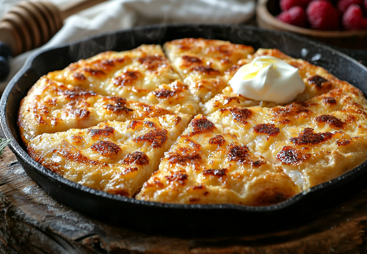 Разогрейте сухую сковороду на среднем огне, выложите лепешку и накройте крышкой. Через 2 минуты переверните — она должна подрумяниться, но остаться мягкой внутри. Готовую лепешку смажьте сливочным маслом и подавайте с медом, ягодами или сметаной.