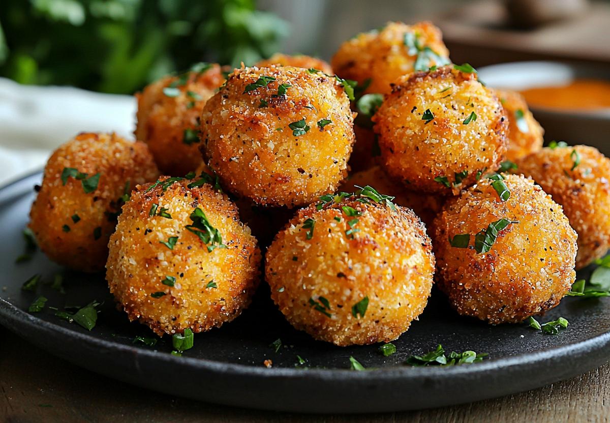 Вам понадобится: 200 г твердого сыра, 100 г моцареллы, 100 г сливочного сыра, 1 яйцо, 3 ст. л. муки, 1 ч. л. копченой паприки, 100 г панировочных сухарей, масло для фритюра. Натрите твердый сыр и моцареллу на мелкой терке, смешайте со сливочным сыром, яйцом, мукой и паприкой. Тщательно вымешайте до однородности. Сформируйте небольшие шарики, обваляйте их в панировочных сухарях. Разогрейте масло во фритюрнице или глубокой сковороде до 180 °C. Обжаривайте шарики партиями по 2–3 минуты до золотистого цвета. Выкладывайте на бумажные полотенца, чтобы удалить излишки масла. Подавайте сразу же, пока сыр внутри тянется!