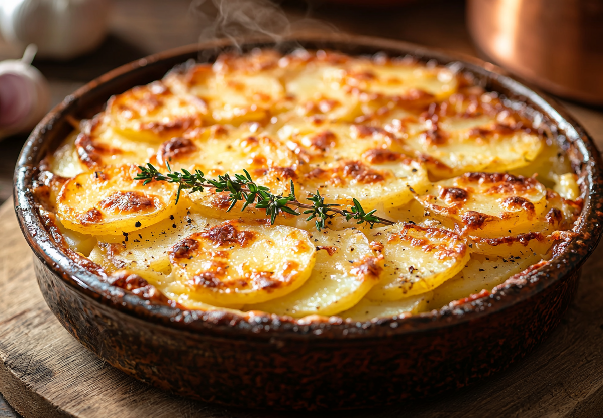 Сырный гратен с картофелем по-французски! Невозможно вкусный и сливочный! Тонкие ломтики картофеля, пропитанные ароматными сливками с тимьяном, под золотистой шапкой из расплавленного сыра. Просто, но изысканно — как в лучших французских ресторанах.