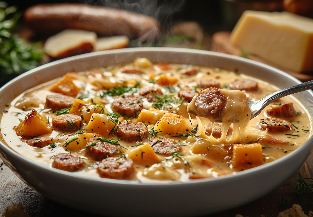Сырный суп с копчеными колбасками! Простой, но добавки попросят все. Этот насыщенный суп с копчеными нотками и нежной сырной сливочностью — вкус детства! Готовится просто, а получается невероятно аппетитным.