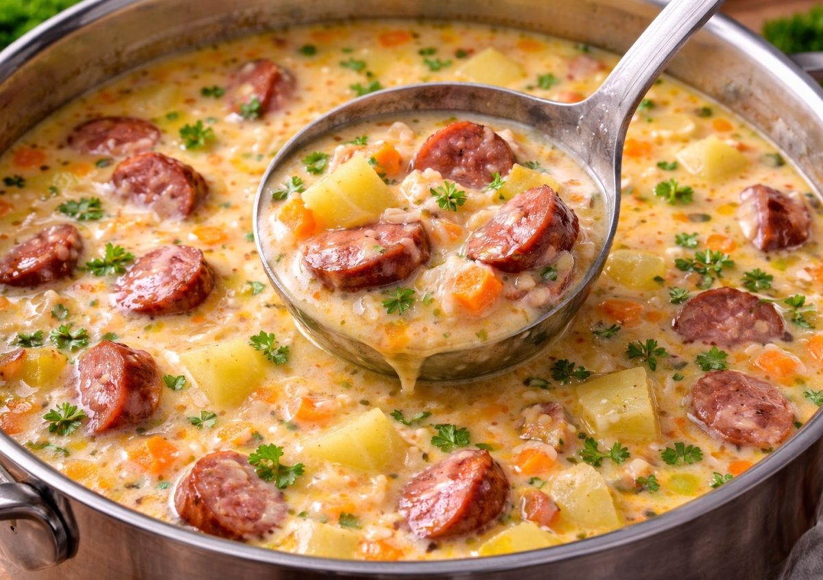 В этом супе все максимально понятно: картошка дает основу, рис делает его более плотным, а плавленый сыр превращает бульон в нежный крем. Колбаса добавляет тот самый аромат, из-за которого хочется налить еще тарелку.
