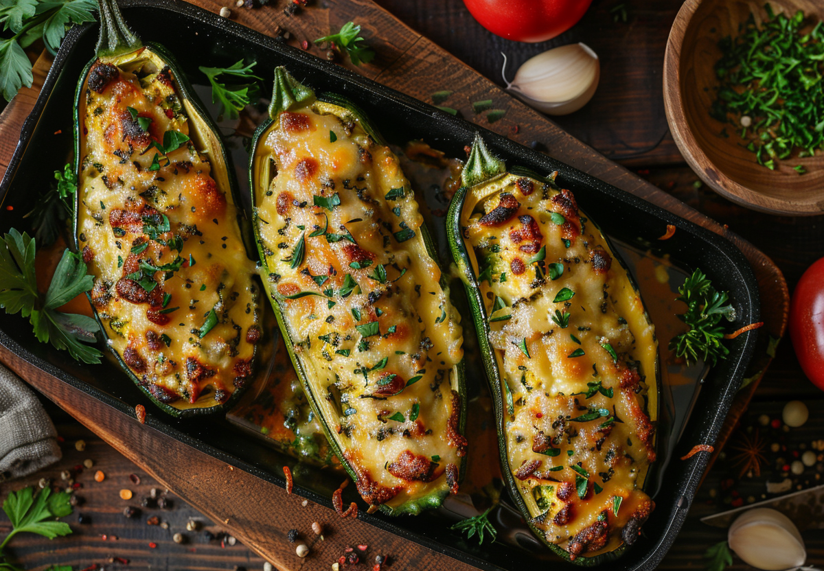 Нужны: 2 молодых кабачка (около 25 см длиной), 400 г смешанного мясного фарша, 1 крупная луковица, 2 дольки чеснока, 1 ст. л. концентрированной томатной пасты, 100 г твердого сыра, 2 ст. л. подсолнечного масла, соль морская, перец черный молотый, пучок свежего укропа.