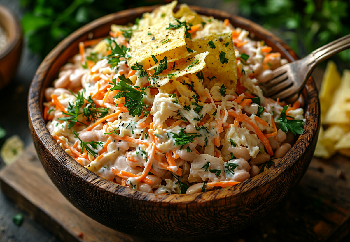 Сытный салат с фасолью, корейской морковью и чипсами! Он вкуснее любых мясных! Этот салат — идеальное сочетание сытности и пикантности. Консервированная фасоль даёт нежную текстуру, корейская морковь — остроту, курица и сыр делают блюдо по-настоящему насыщенным, а хрустящие чипсы добавят неожиданный контраст!