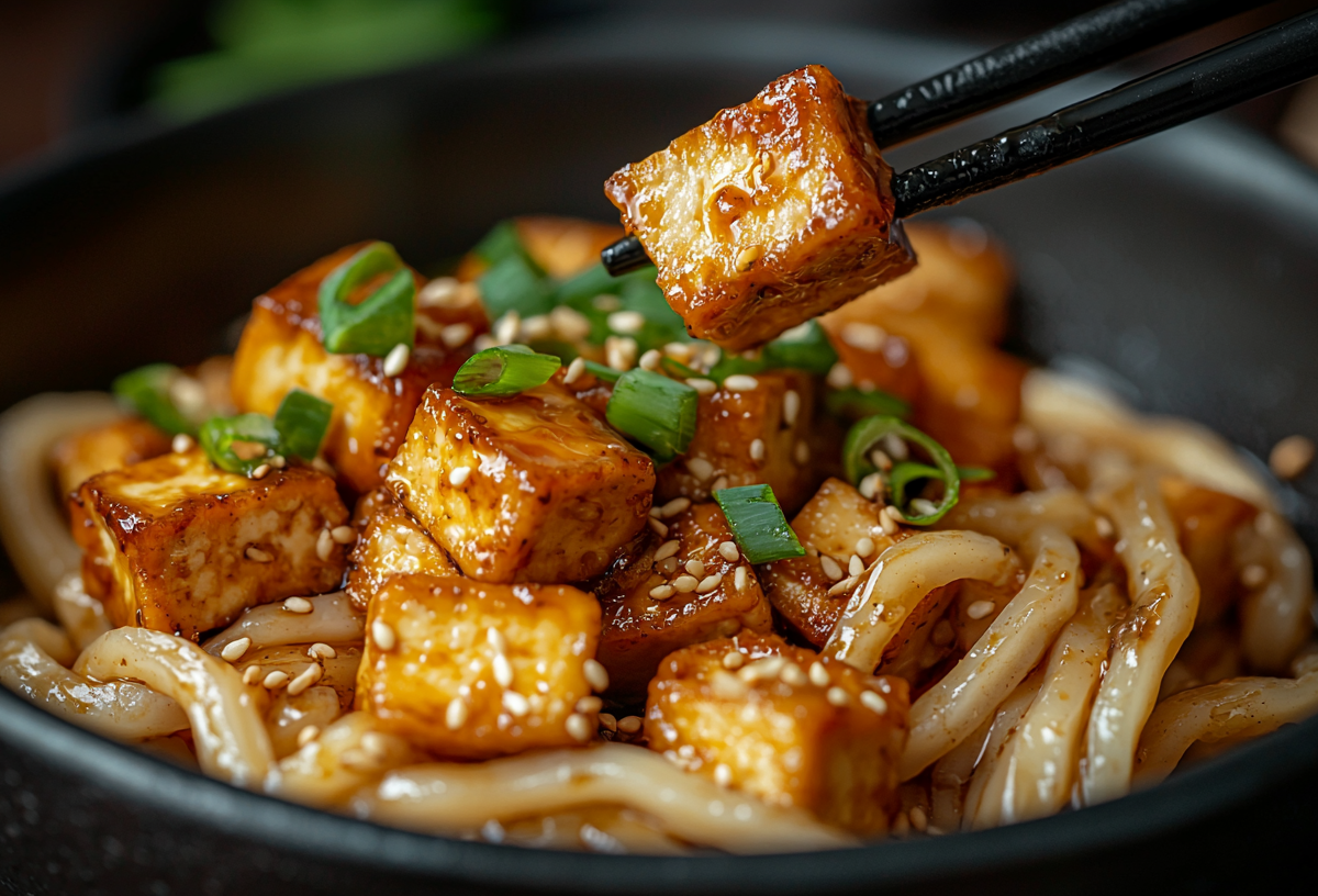Отдельно обжарьте 200 г тофу до золотистости и добавьте к овощам. Залейте 250 г остро-сладкого соуса.