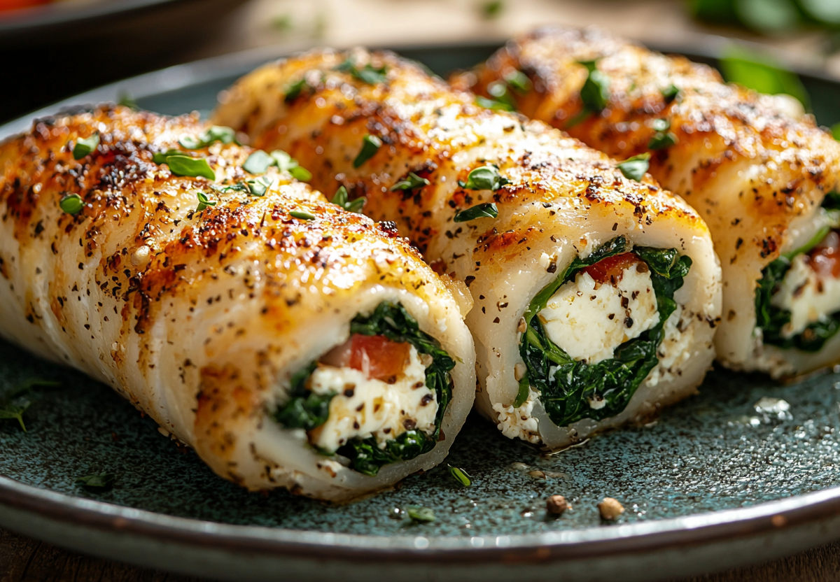 Рулетики из минтая с начинкой из феты и шпината представляют собой изысканное блюдо, которое сочетает нежность рыбы и пикантность сырной начинки. Рулеты отличаются оригинальной подачей и насыщенным вкусом, что делает их идеальным выбором для праздничного стола.