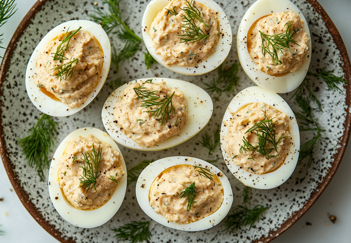 Выкладываю готовые фаршированные яйца на блюдо. По желанию украшаю мелко порубленной зеленью, зерном граната или каперсом. Убираю в холодильник на 30–60 минут для охлаждения и настаивания перед подачей.