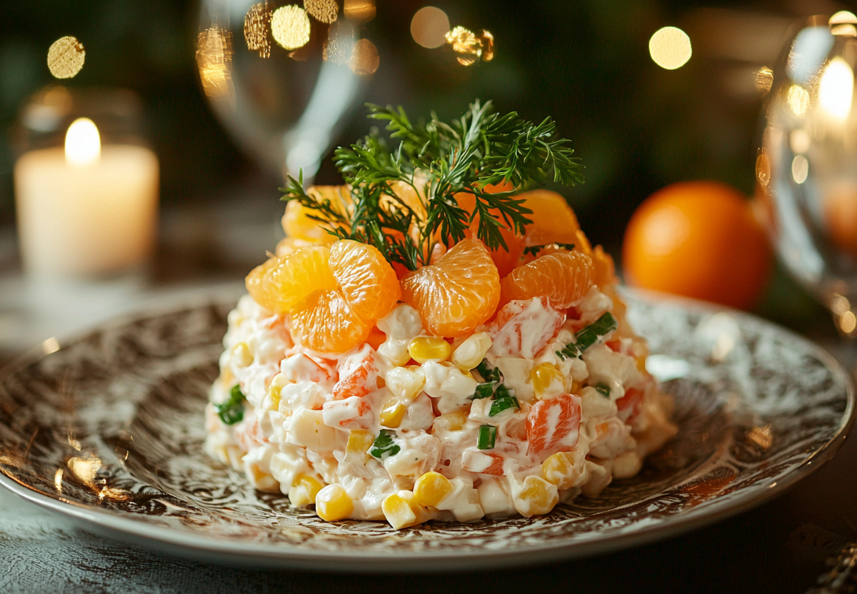 Попробуйте невероятно вкусный и свежий салат с крабовыми палочками по новогоднему рецепту с мандаринами. Он станет настоящим открытием для вашего праздничного стола.