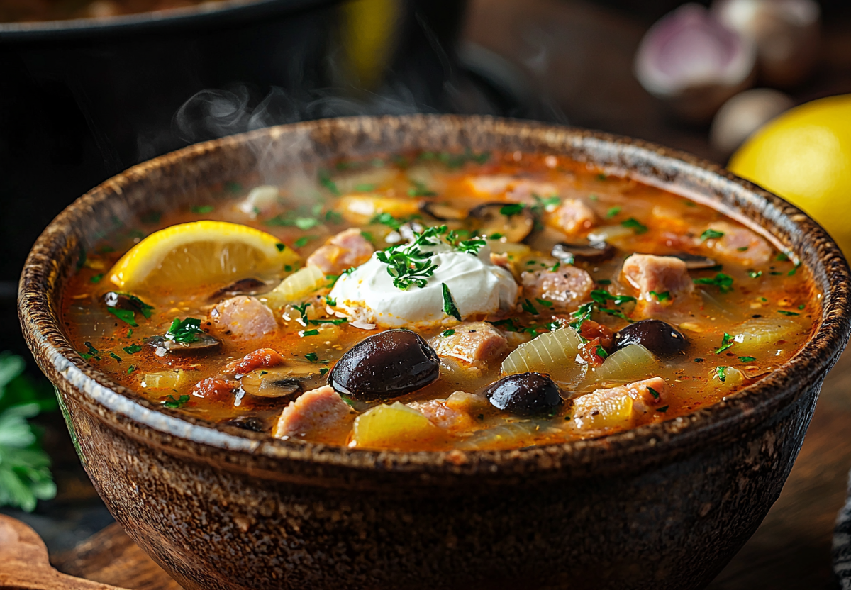 Для сочной солено‑копченой основы возьмите 200 г копченой колбасы, 200 г копченых ребрышек и 200 г ветчины. Нарежьте все аккуратной соломкой. В кастрюле с толстым дном сперва обжарьте нарезанный репчатый лук и 200 г грибов, затем добавьте два соленых огурца и два помидора, приправьте двумя столовыми ложками томатной пасты. Залейте кипятком, положите копчености и проварите около 10 минут. В завершение добавьте 150 г оливок. Подавайте солянку горячей, украсив долькой лимона и добавив ложку сметаны — так вкус раскроется полностью. Получается сытно, ароматно и очень по‑осеннему уютно!