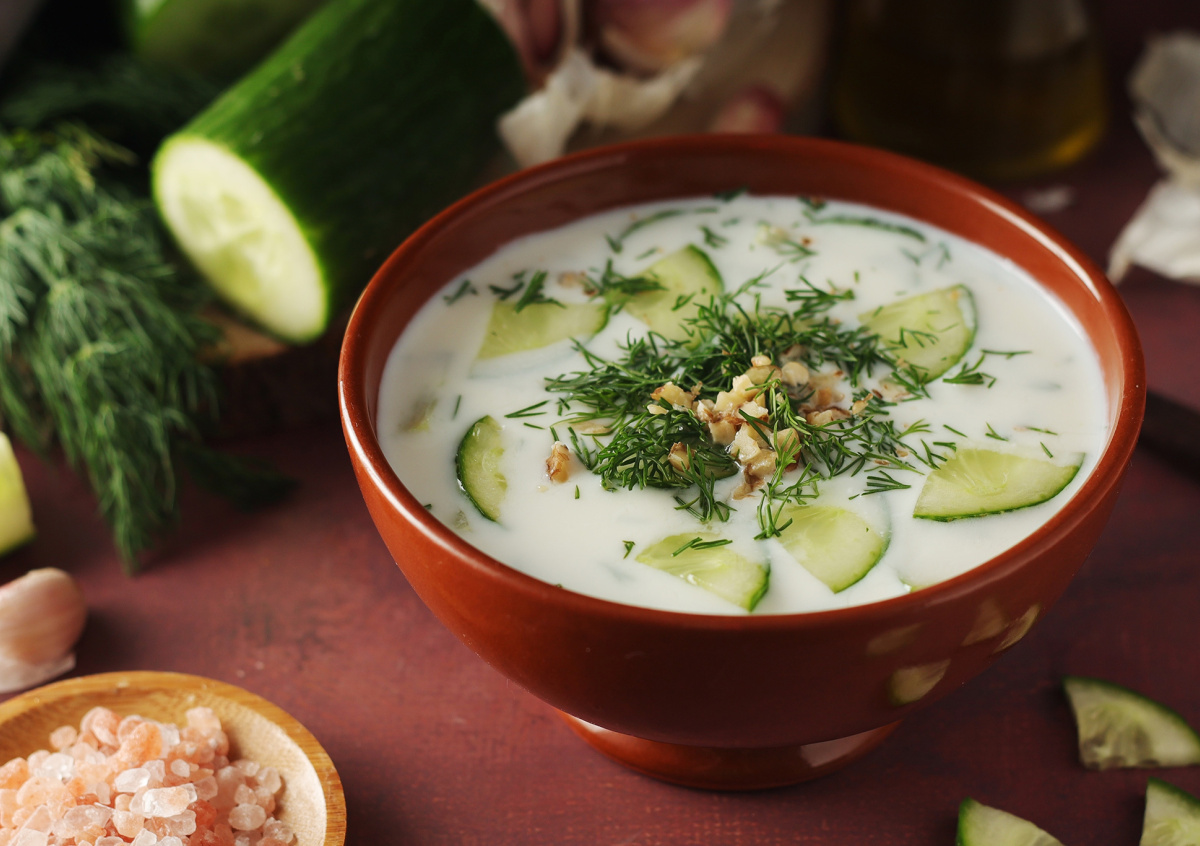 После праздничных застолий организму требуется поддержка, и правильное питание — один из лучших способов восстановить силы. Болгарский холодный суп таратор с кефиром — легкое, освежающее и полезное блюдо, которое помогает снять симптомы похмелья благодаря сочетанию кисломолочного напитка, свежих овощей и ароматных специй. А еще оно очень просто готовится: основных ингредиентов всего три. Вам понадобятся кефир, грецкие орешки и огурцы.