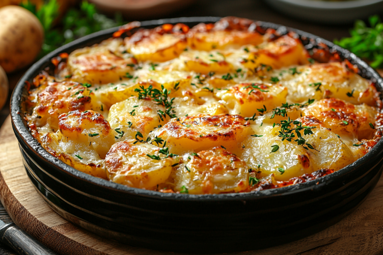 Мясо нарезаю небольшими кусочками поперек волокон. Разогреваю сковороду с маслом, обжариваю мясо со специями до румяной корочки. Картофель очищаю и нарезаю кубиками среднего размера. Добавляю картофель к мясу, вливаю немного воды (примерно 100 мл), солю, накрываю крышкой и тушу на среднем огне 15–20 минут до мягкости картофеля. Периодически проверяю, чтобы жидкость полностью не выкипела. Перекладываю содержимое сковороды в жаропрочную форму. Сыр натираю на крупной терке и обильно посыпаю сверху. Отправляю в разогретую до 180 °C духовку на 5–7 минут, пока сыр не расплавится и не подрумянится. Подаю сразу же, прямо в форме, посыпав свежей рубленой зеленью. Идеально сочетается со свежими овощами или легким салатом.