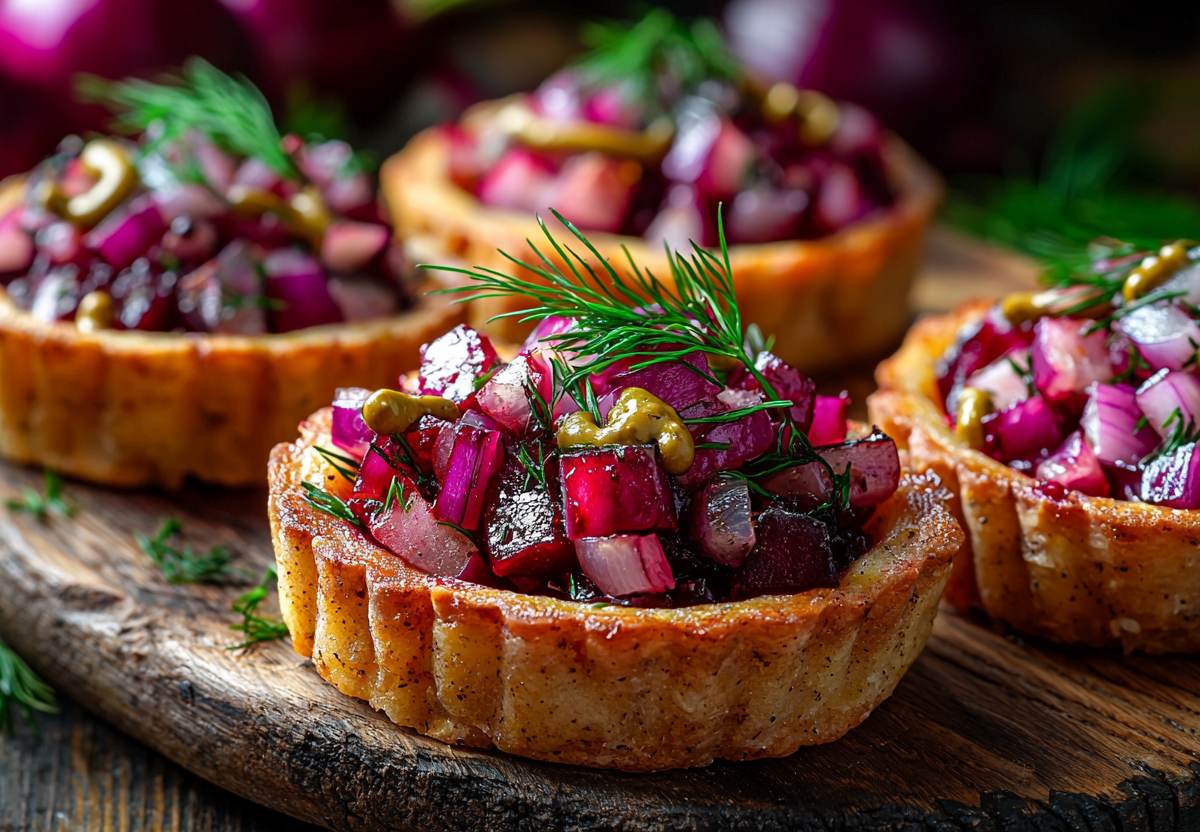 Тарталетки из картошки с сельдью и свеклой! Приготовьте один раз — и не остановитесь, потому что это настоящая вкуснятина из простых продуктов! Эти картофельные тарталетки — настоящий хит для праздничного стола! Хрустящие корзинки из отварного картофеля, нежная слабосоленая сельдь с луком и острой горчицей. Готовится за 30 минут, выглядит эффектно — гости будут в восторге!