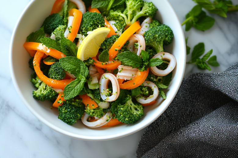 На сковороде разогреваю 1 ст. л. масла и быстро обжариваю лук с перцем 3–4 минуты, перекладываю в миску. Затем добавляю масло и обжариваю кальмары по 1,5–2 минуты с каждой стороны. Для заправки смешиваю оливковое масло — 30 мл, сок и цедру 0,5 лимона, чеснок — 2 зубчика, мяту — 5–7 листиков, тимьян — 2–3 веточки, чили — 0,5 ч. л., соль и перец. Соединяю все с овощами и брокколи и подаю сразу.